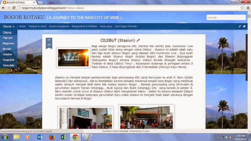 Perhatikan tombol yang diberi tanda panah pada gambar dibawah . Bila diklik maka akan terbuka drop down menu berisi tujuh buah nama Magazine , Classic , Flipcard , Mosaic , Sidebar , Snapshot dan Timeslide . Setting dari blog ini di default pada Magazine karena dianggap bisa mewakili ide dasar blog ini . Hanya tentu saja akan terserah kepada para pembaca untuk menentukan tampilan mana yang paling enak dilihat di layar monitor